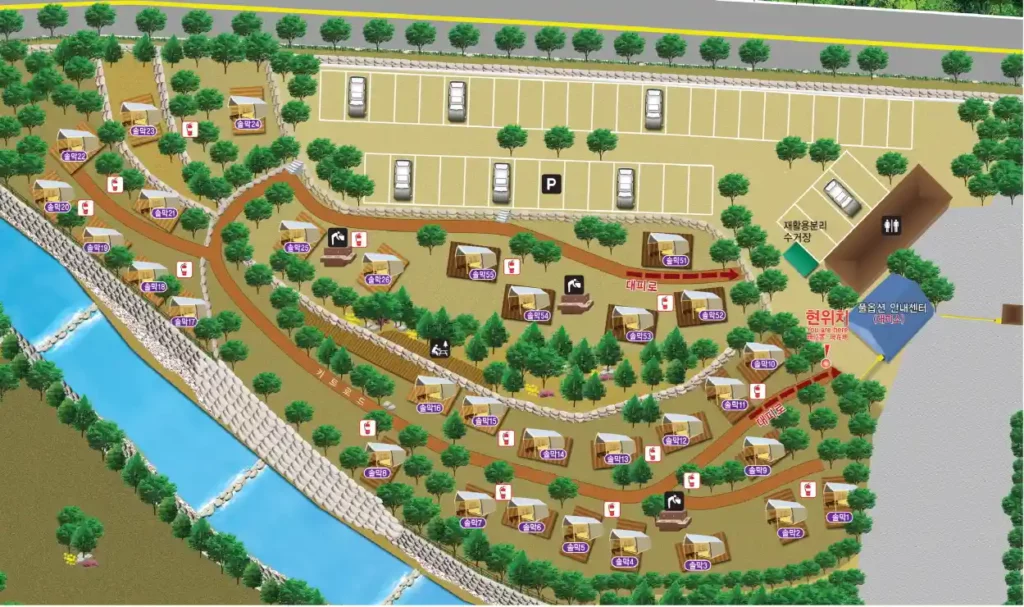 야영장 앞에 작은 계곡, 냇가가 있어서 여름철 아이들과 함께 놀기 좋은 곳입니다.
