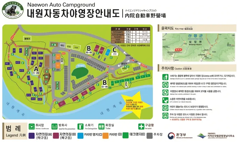 다시 캠핑장 이야기로 돌아와서, 내원 야영장은 위에서 확인하실 수 있듯이 노지, 데크, 자차 카라반, 캠핑카 또는 체류 카라반이 있어서 캠핑 초보부터 개인 장비를 잘 갖춘 프로 캠퍼들도 2박 3일 체류하기 좋은 곳입니다. 코로나 시국에 리모델링을 거쳐 시설 대부분이 리뉴얼되었고 깔끔합니다. 또한 국립공원 산하 기관이라서 그런지 시설 유지가 잘 되어 있어 쾌적하게 편의시설 및 공용시설을 이용할 수 있습니다.